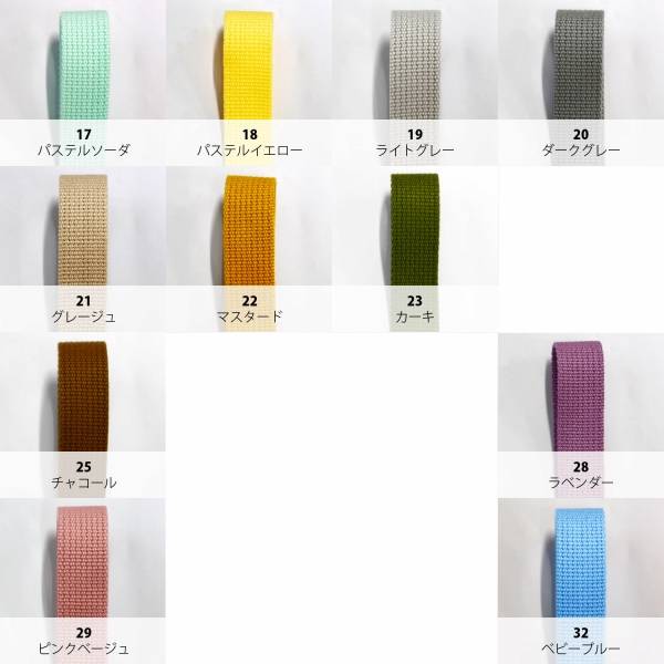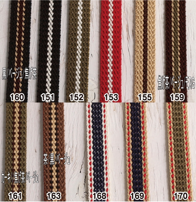 細身のテープです。小さなお子様のカバン用持ち手やふちどり、模様使いなどカバンのアクセント、持ち手に使用できます。 |
